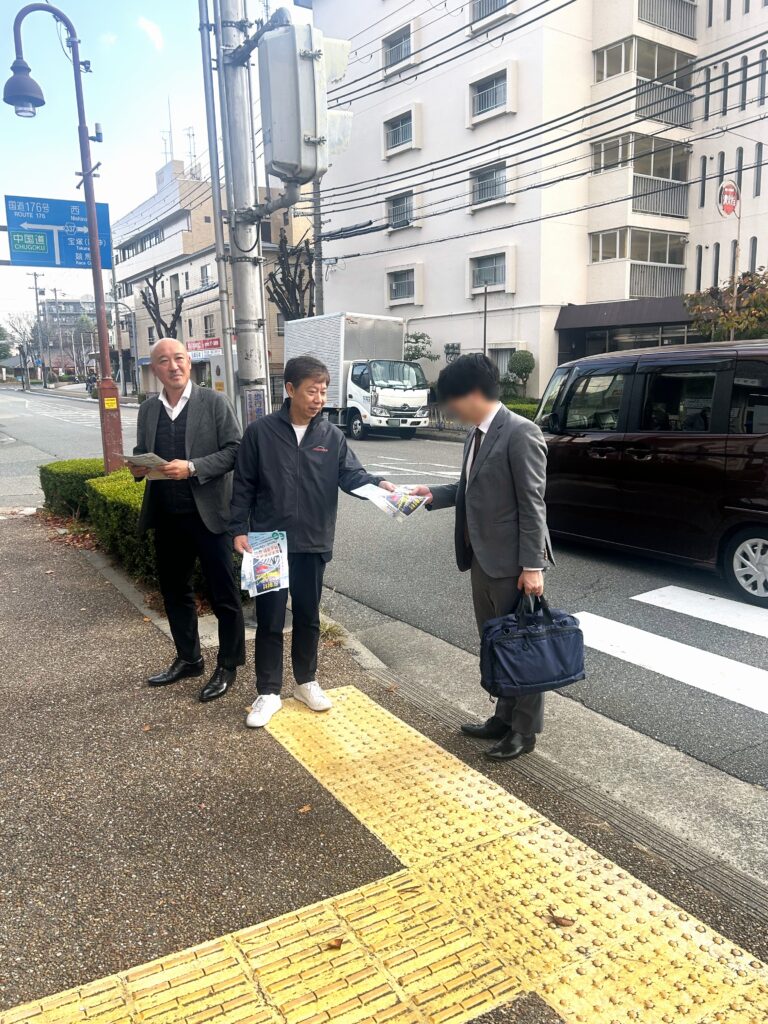 弊社事務所近くで交通事故防止運動のチラシをまきました。